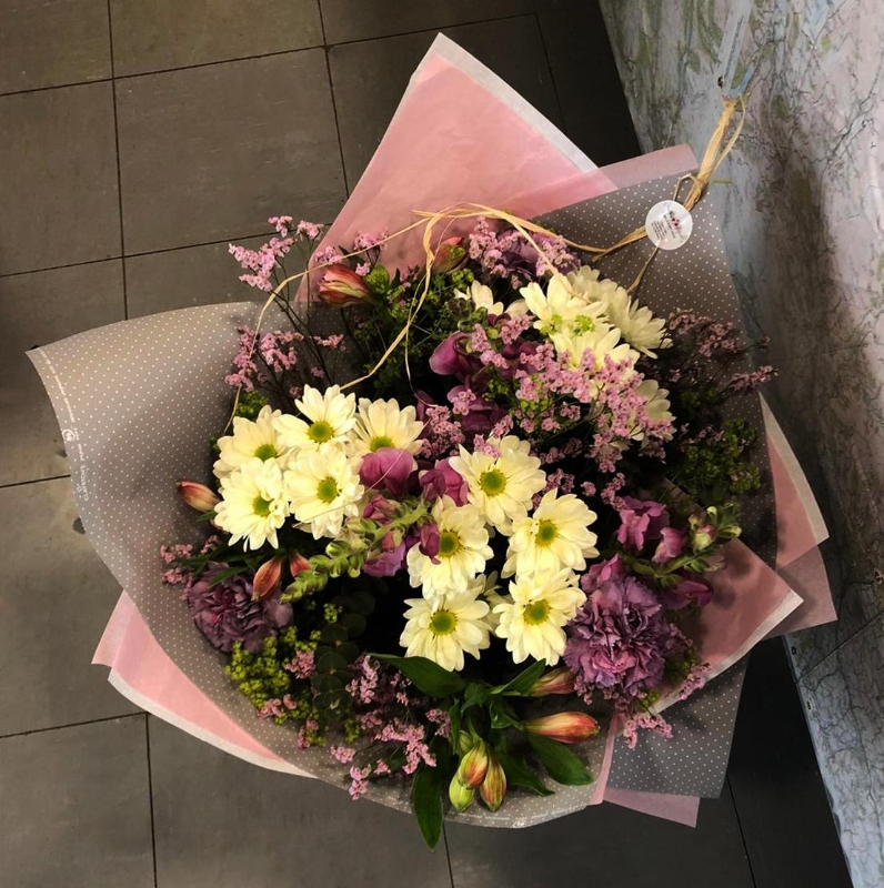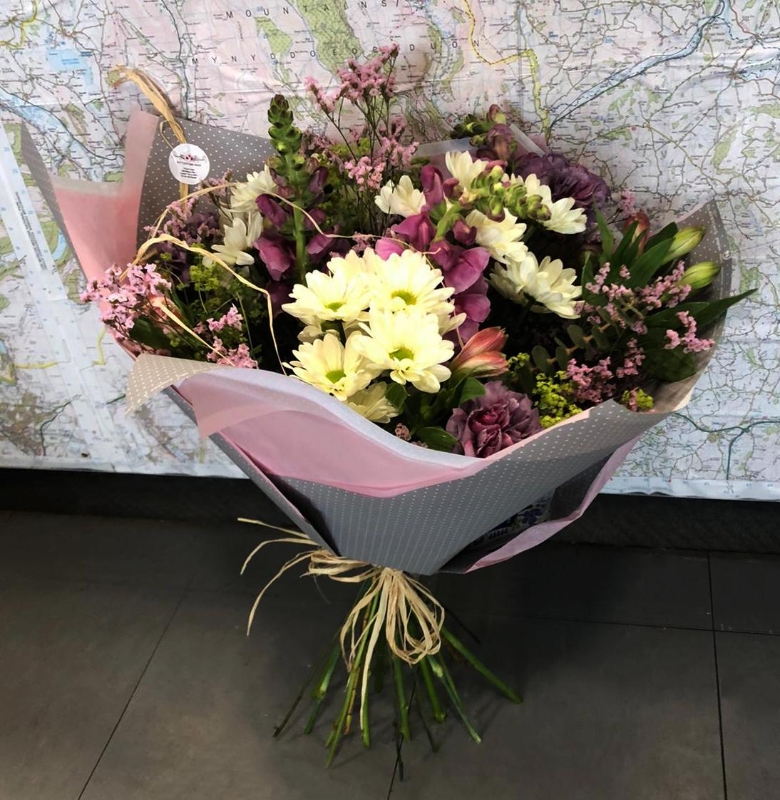 A selection of pink, purple and cream seasonal flowers. Hand-tied together with the stems out ready to be placed straight into your vase for a "fuss free" selection of gorgeous flowers.