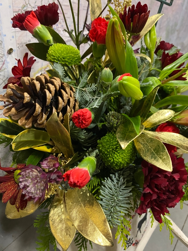 A hessian bag to compliment a traditional, joyous selection of red and green flowers paired with mix seasonal foliage arranged in floral foam.