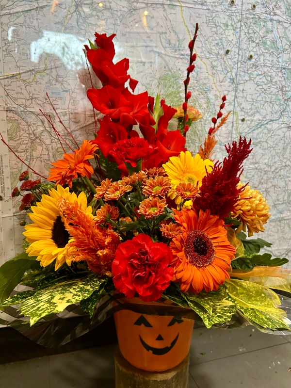 Autumnal coloured fresh flowers and foliage arranged with floral foam inside a plastic pumpkin shaped container which then can be reused afterwards.